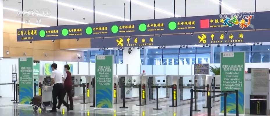 成都海關(guān)所屬雙流機場海關(guān)旅檢二科科長 李霄林:為了應(yīng)對大運會人員集中通關(guān)的情況,我們設(shè)置了6條大運會海關(guān)專用通道,并對集成了手提行李機檢等8項功能的智能通道進(jìn)行了升級,由原來的“單通道”升級為“雙通道”,單人的通關(guān)速度提升了40%。