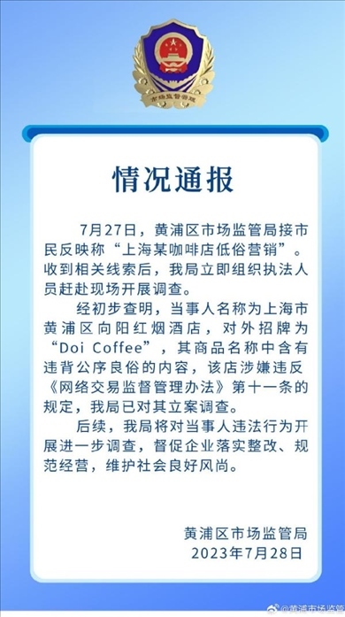 ·上海黃浦通報“咖啡店低俗營銷”:違背公序良俗,已立案調(diào)查。