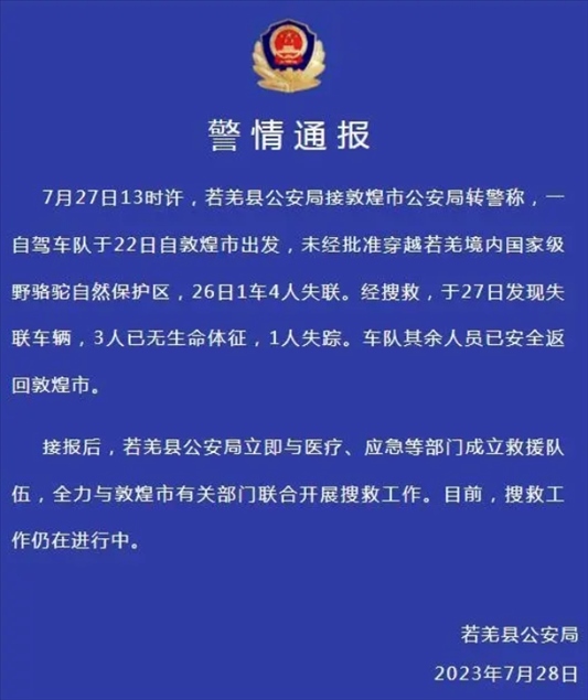 ·新疆若羌縣警方通報一車隊未經(jīng)批準(zhǔn)穿越自然保護(hù)區(qū):3人無生命體征,1人失蹤。