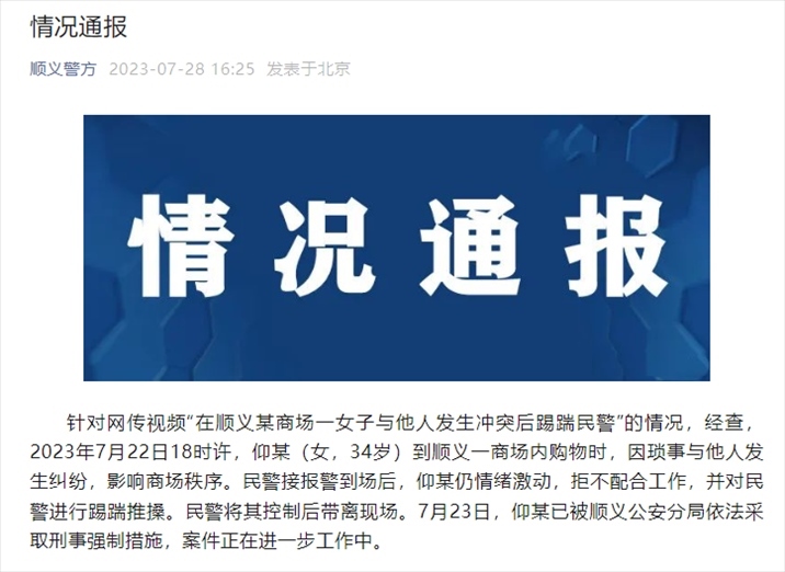 ·網(wǎng)傳“北京順義某商場一女子與他人發(fā)生沖突后踢踹民警”,警方通報。