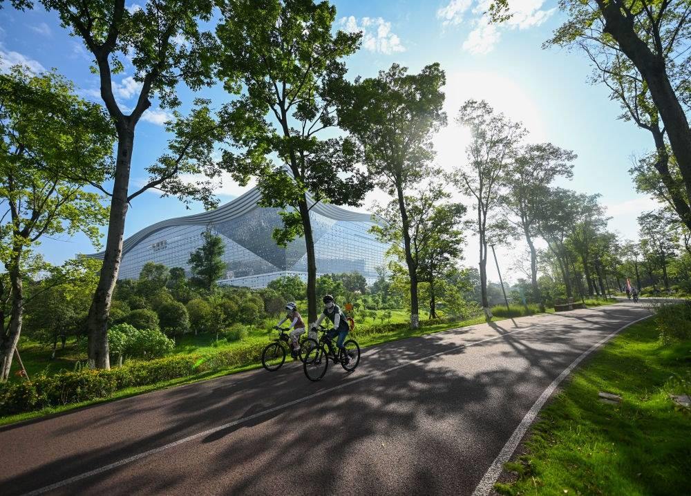 人們?cè)诔啥几咝聟^(qū)桂溪生態(tài)公園騎行。