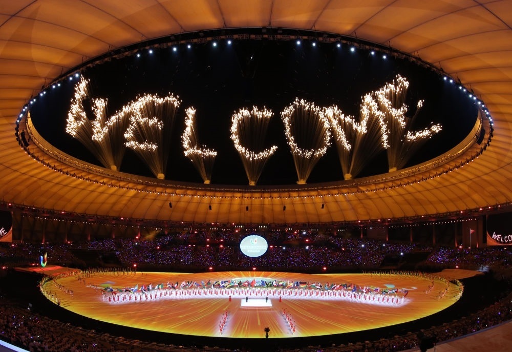 璀璨焰火,照亮碧波蕩漾的東安湖,在世界各地青年學(xué)生的熱切注目中,第三十一屆世界大學(xué)生夏季運(yùn)動(dòng)會(huì)開幕。