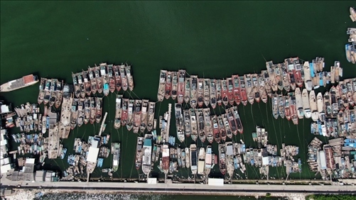 7月27日,廣東省潮州市饒平縣三百門漁港里回港避風(fēng)的漁船(無(wú)人機(jī)照片)。 新華社記者王瑞平攝