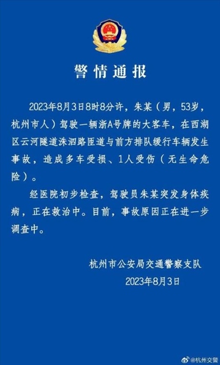 ·杭州警方通報(bào)大客車隧道與多車相撞:客車駕駛員突發(fā)疾病。