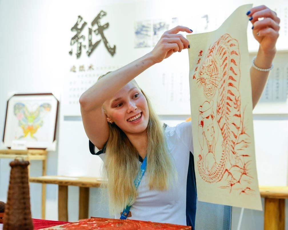 8月3日,在成都大運(yùn)村的互動(dòng)體驗(yàn)中心,芬蘭運(yùn)動(dòng)員杰茜卡·卡哈拉展示自己制作的夾江年畫。新華社記者 沈伯韓 攝