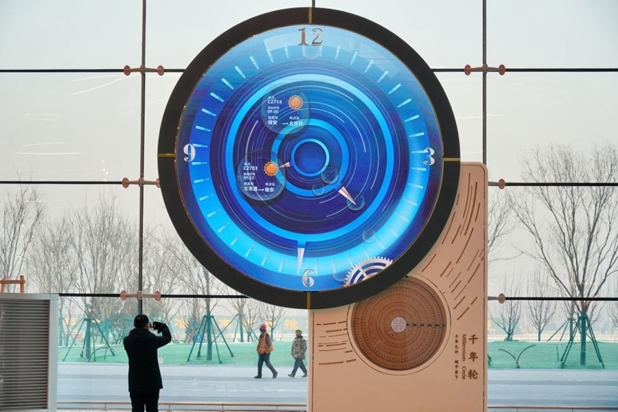 旅客在京雄城際鐵路雄安站內(nèi)拍攝“千年輪”(2020年12月27日攝)。新華社記者 牟宇 攝