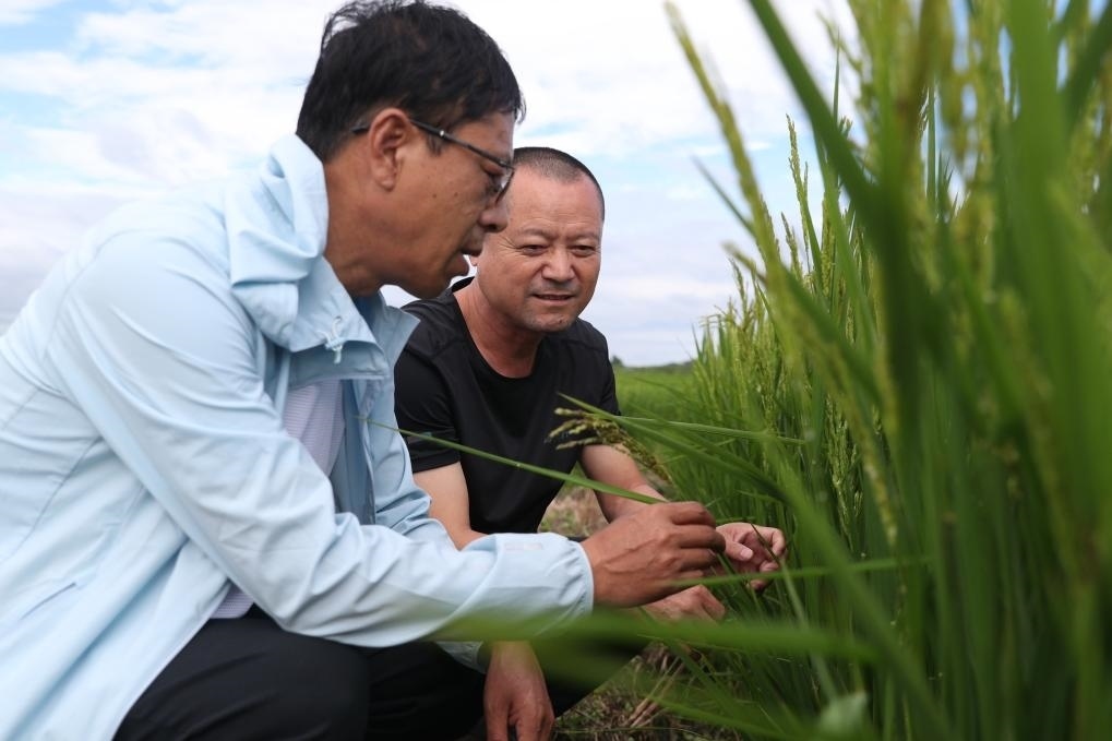 8月11日,黑龍江省尚志市農(nóng)業(yè)技術(shù)推廣中心的工作人員在當(dāng)?shù)匾惶幈缓樗葸^的水稻田里查看水稻情況。新華社記者張濤 攝