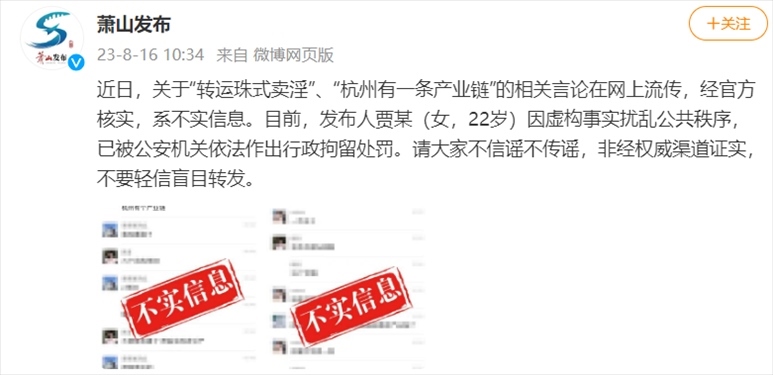 ·杭州蕭山辟謠“轉(zhuǎn)運珠式賣淫”:發(fā)布人已被行政拘留。