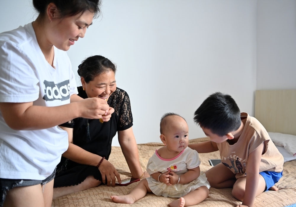 轉移群眾在天津市西青區(qū)親和儒園安置點內(nèi)照看小孩(8月9日攝)。新華每日電訊李然攝