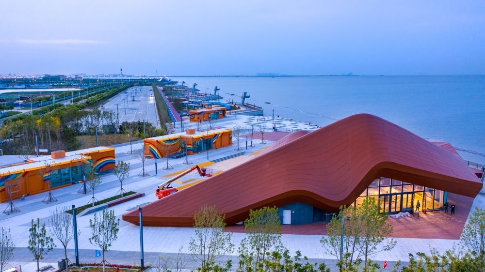從淺灘向岸上望去,一只面朝大海的“貝殼”、一座沿海岸線起伏的“沙丘”和一架巨大的“紙飛機(jī)”映入眼簾,在這三座造型別致的游客服務(wù)中心建筑之間,冰飲、小吃等小攤店鋪星羅棋布。
