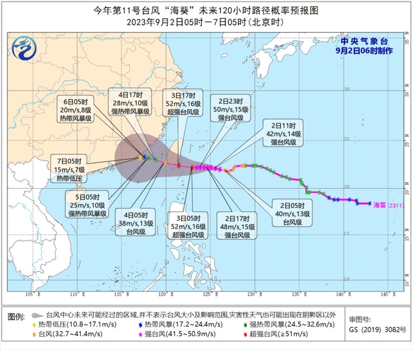 大風(fēng)預(yù)報:9月2日08時至3日08時,受“蘇拉”影響,南海西北部、北部灣東部、瓊州海峽及廣東沿海、廣西南部沿海、珠江口以及香港和澳門等地將有7-9級、陣風(fēng)10-11級的大風(fēng),“蘇拉”中心經(jīng)過的附近海面或地區(qū)風(fēng)力有12-13級、陣風(fēng)14-15級;受“??庇绊?,臺灣海峽、浙江南部沿海、福建沿海、廣東東部沿海、臺灣島沿海將有6-7級,陣風(fēng)8級大風(fēng),臺灣以東洋面部分海域風(fēng)力可達(dá)8-10級,陣風(fēng)11-12級,“海葵”中心經(jīng)過的附近海面風(fēng)力可達(dá)12-13級,陣風(fēng)14級。