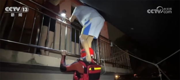 在轉(zhuǎn)移另一處被困人員時,救援人員搭起人梯,讓被困群眾踩著自己的肩膀轉(zhuǎn)移。