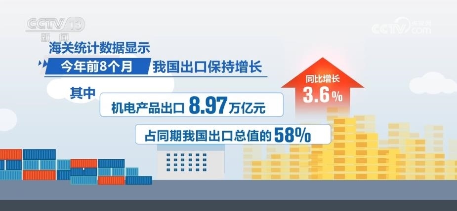 海關統(tǒng)計數據顯示,2023年前8個月,我國出口保持增長,其中,機電產品出口8.97萬億元,同比增長3.6%,占同期我國出口總值的58%;汽車及零配件、船舶、電工器材出口分別增長50.1%、28%、18.6%。