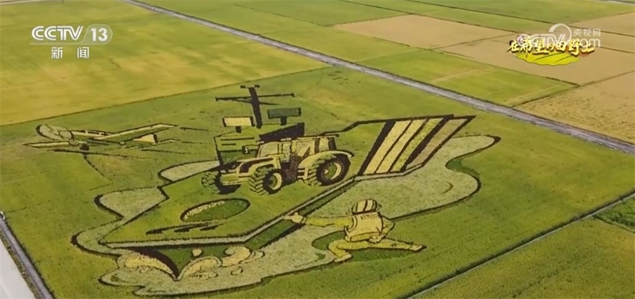總臺(tái)央視記者 蔣樹林:金秋9月的稻田是什么顏色的?9月的稻香又是什么味道?來這里,有可能會(huì)找到您想要的答案。我現(xiàn)在是在黑龍江北大荒閆家崗農(nóng)場(chǎng)。大家來看,這個(gè)稻田觀景臺(tái)有十多米高,因此站在這里,秋日稻田大片的圖案映入眼簾,今年稻田畫以“鄉(xiāng)村振興”“數(shù)字農(nóng)業(yè)”為主題,生動(dòng)展現(xiàn)了“讓農(nóng)業(yè)更美好、讓農(nóng)民更幸?!钡拿篮迷妇?。稻田畫是農(nóng)民們勤勞與智慧的展現(xiàn),他們用稻田畫為家鄉(xiāng)水稻代言,而對(duì)于在黑土地打拼的北大荒人而言,還有更重要的意義。