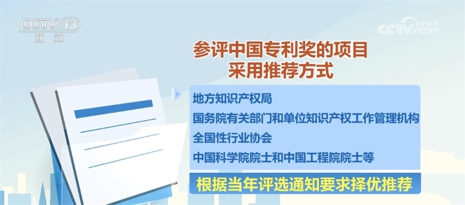 參評中國專利獎的項目采用推薦方式,由地方知識產(chǎn)權(quán)局、國務(wù)院有關(guān)部門和單位知識產(chǎn)權(quán)工作管理機構(gòu)、全國性行業(yè)協(xié)會、中國科學(xué)院院士和中國工程院院士等根據(jù)當(dāng)年評選通知要求擇優(yōu)推薦。經(jīng)過評審之后,在國家知識產(chǎn)權(quán)局政府網(wǎng)站公示評選結(jié)果,接受社會監(jiān)督。