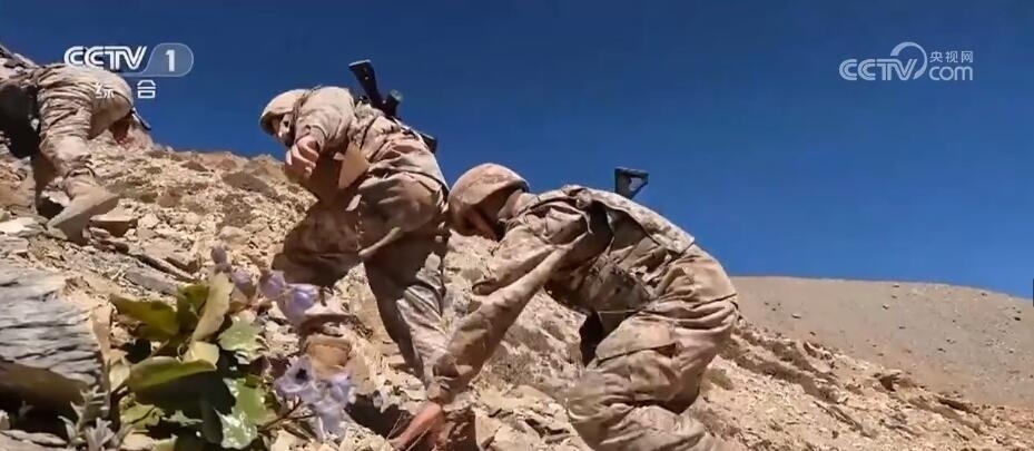 一路走走停停艱難前行。巡邏車行駛至距離點(diǎn)位6公里處停了下來(lái),由于道路塌陷,官兵們只好下車改為徒步巡邏。行走在坡度近70度的陡峭山路上,路面全是碎石,加上海拔不斷攀升,這對(duì)巡邏官兵的體能是極大的挑戰(zhàn)。經(jīng)過近4個(gè)小時(shí)的艱難攀爬,巡邏分隊(duì)終于到達(dá)了點(diǎn)位。