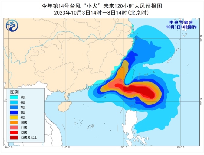 大風預報:3日下午至8日,臺灣以東洋面、巴士海峽、東海大部、臺灣海峽、南海東北部以及杭州灣、浙江沿海、福建沿海、廣東東南部沿海以及臺灣島沿海將有6~8級大風,其中,臺灣以東洋面、巴士海峽、臺灣海峽、南海東北部部分海面、福建沿海、廣東東南部沿海、臺灣島東南部和西部沿海的風力將有9~12級,“小犬”中心經(jīng)過的附近海面風力可達13~16級,陣風17級。