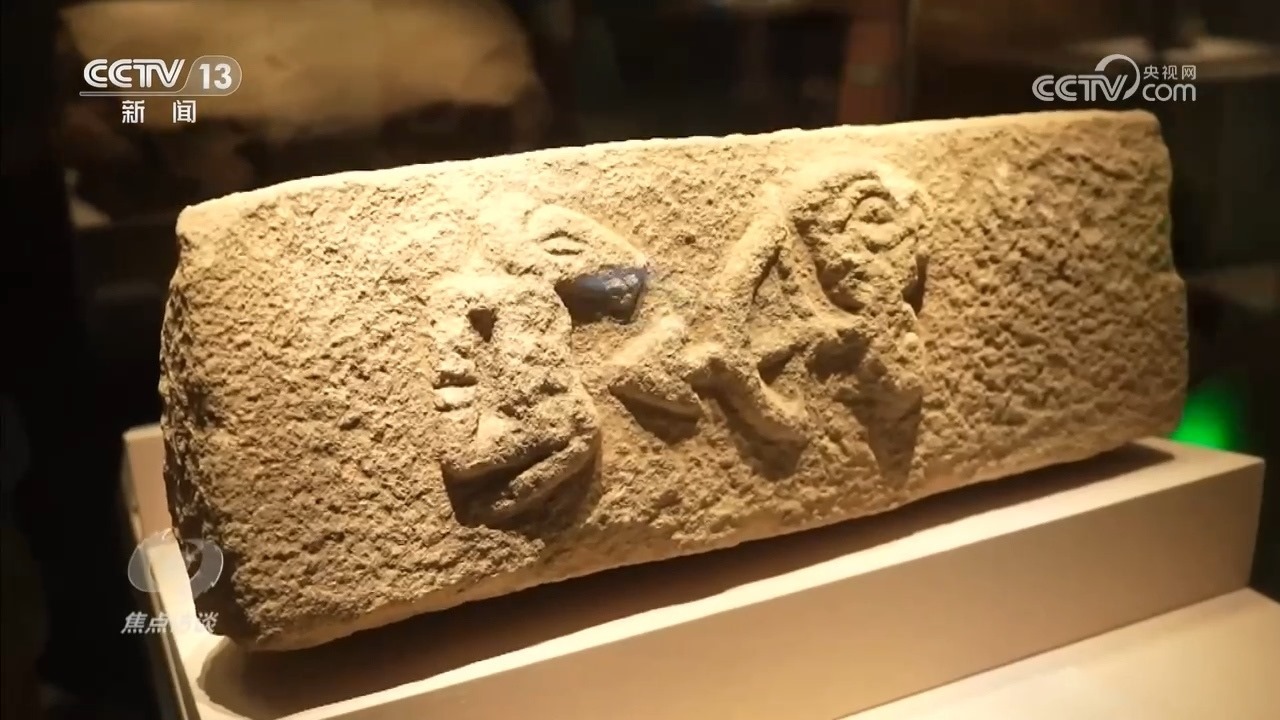 龜甲出土于河南省漯河市舞陽縣賈湖遺址,當時遺址內發(fā)現(xiàn)17例刻在龜甲、骨器上的符號,內容都與占卜相關,被稱為賈湖刻符。符號圖畫為我們揭開了祖先們當時的生活圖景?!叭松漶R石雕”出土于陜西榆林神木市石峁遺址,在距今約4000年前,先人們以浮雕的方式成圖,一人持弓箭射馬,弓、弦、箭一樣不少。