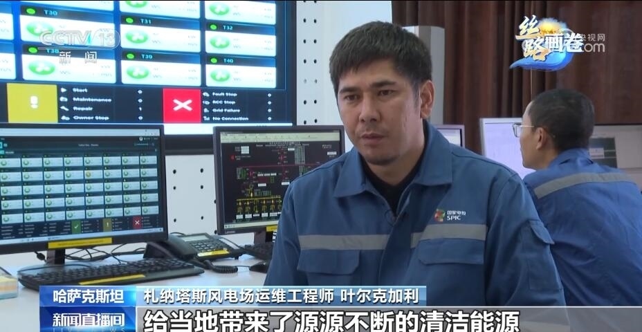 總臺記者 張譽耀:這里就是札納塔斯,哈薩克斯坦最大的風(fēng)力發(fā)電場之一,像我身后這樣一座風(fēng)能發(fā)電機(jī)能滿足當(dāng)?shù)丶s4000戶家庭的用電需求,而我身后一共有40座這樣的風(fēng)能發(fā)電機(jī),也就是說能夠滿足當(dāng)?shù)?6萬戶家庭的用電需求。正是這一座座轉(zhuǎn)動的風(fēng)能發(fā)電機(jī),點亮了札納塔斯這座小城的日常生活。