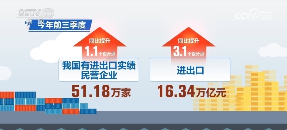 2023年前三季度,我國有進出口實績的民營企業(yè)51.18萬家,進出口16.34萬億元,分別占整體的85.7%、53.1%,同比分別提升1.1個、3.1個百分點。