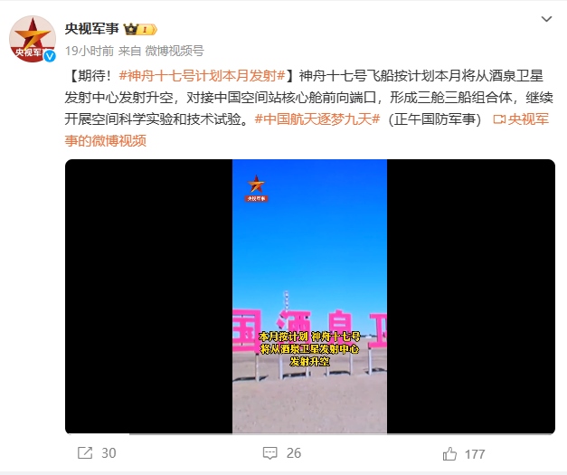 據(jù)“央視軍事”微博賬號(hào)報(bào)道 神舟十七號(hào)飛船按計(jì)劃本月(十月)將從酒泉衛(wèi)星發(fā)射中心發(fā)射升空,對(duì)接中國(guó)空間站核心艙前向端口,形成三艙三船組合體,繼續(xù)開(kāi)展空間科學(xué)實(shí)驗(yàn)和技術(shù)試驗(yàn)。