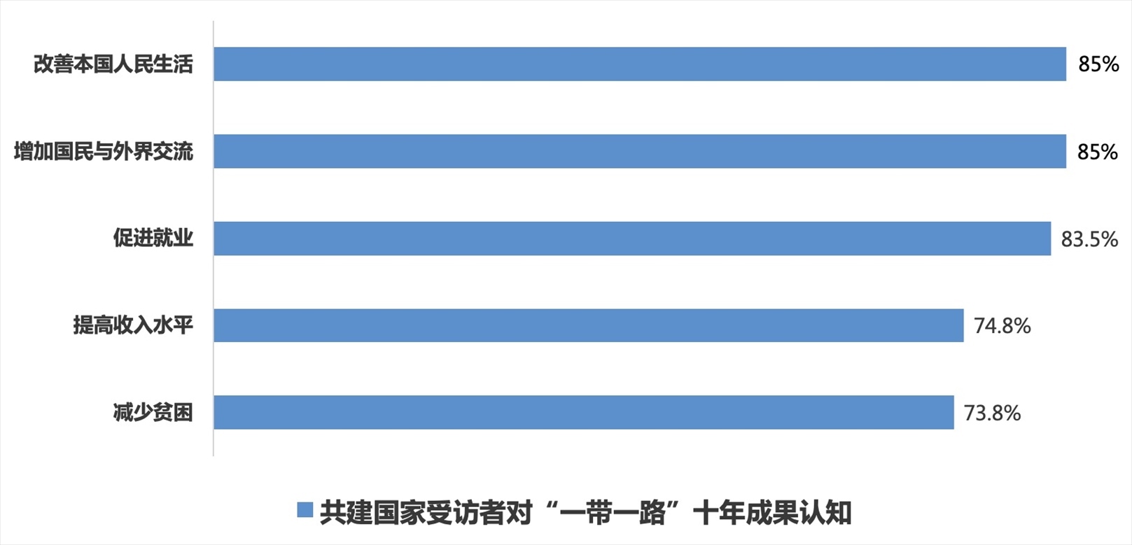 “一帶一路”倡議下一個(gè)個(gè)“惠而實(shí)”的民生工程、民心工程,為各國人民帶來實(shí)實(shí)在在的獲得感、幸福感和安全感,85%的共建國家受訪者認(rèn)為“一帶一路”切實(shí)改善了本國人民的生活;85%的共建國家受訪者認(rèn)為通過“一帶一路”民眾獲得了更多與外界交流互鑒的機(jī)會(huì);分別有83.5%、74.8%和73.8%的共建國家受訪者認(rèn)可共建“一帶一路”在促進(jìn)就業(yè)、提高居民收入水平和減少貧困方面的作用;86.5%的共建國家受訪者認(rèn)為“一帶一路”倡議和“以人民為中心”的理念高度契合,惠及全球民眾的愿景正在逐步變?yōu)楝F(xiàn)實(shí)。