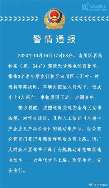 ·重慶警方通報:老人駕駛無牌電動四輪車搭載3名老年朋友失控墜河,4人死亡。