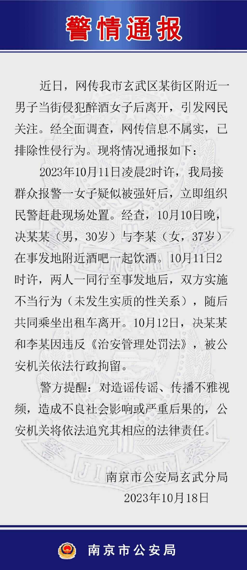 ·南京警方通報網(wǎng)傳男子當(dāng)街侵犯女子:排除性侵,二人被行拘。