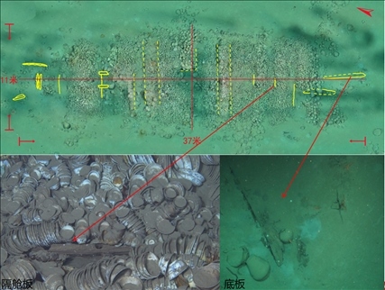 沉船遺址水深約30米,主體區(qū)域殘存有木質(zhì)船體和成摞擺放的船貨堆積,范圍約300平方米??脊虐l(fā)掘發(fā)現(xiàn),沉船船體殘長約16.95米,最寬處保存約4.5米,殘存9道隔艙板和10個船艙,單層板結(jié)構(gòu),發(fā)現(xiàn)桅座、龍骨板、龍骨補強材以及舭龍骨等船體構(gòu)件。
