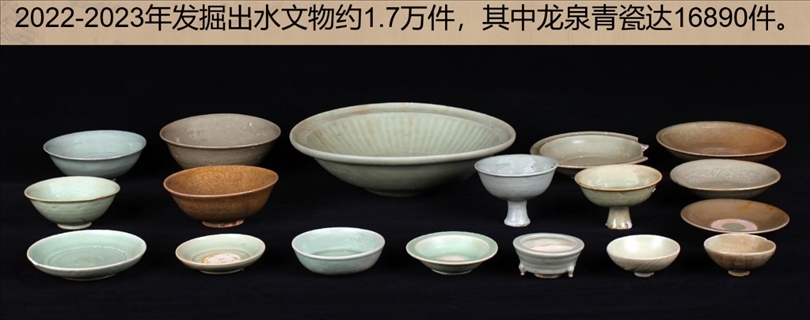 發(fā)掘出水文物標(biāo)本約1.7萬件,主要為龍泉青瓷和陶罐、鉛錘、印章等船上生活、航海相關(guān)文物。其中龍泉青瓷數(shù)量達到1.6萬余件,器形包括碗、盤、碟、盞、洗、缽、香爐和高足杯等,年代為元代晚期,為典型的外銷貿(mào)易瓷。結(jié)合溫州朔門古港的考古發(fā)現(xiàn),推測該沉船可能是從溫州港出海前往東南亞的民間貿(mào)易商船。