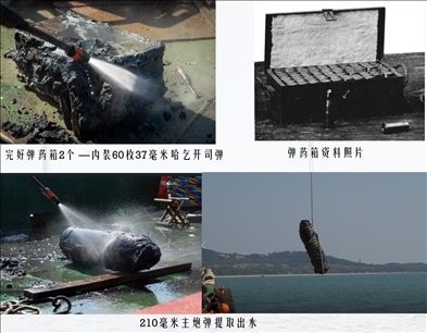 靖遠(yuǎn)艦于舯部發(fā)現(xiàn)2箱完好的37毫米哈乞開司炮彈、艏部發(fā)現(xiàn)1枚210毫米主炮開花彈。