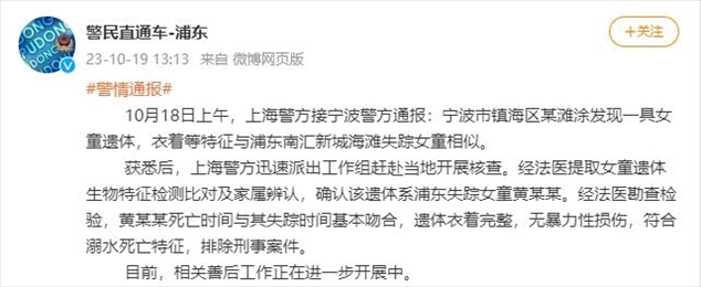 ·上海4歲走失女童遺體在寧波市某灘涂被發(fā)現(xiàn),排除刑事案件。