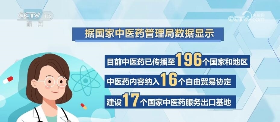 據(jù)國(guó)家中醫(yī)藥管理局?jǐn)?shù)據(jù)顯示,目前中醫(yī)藥已傳播至196個(gè)國(guó)家和地區(qū),中醫(yī)藥內(nèi)容納入16個(gè)自由貿(mào)易協(xié)定,建設(shè)17個(gè)國(guó)家中醫(yī)藥服務(wù)出口基地。與國(guó)際標(biāo)準(zhǔn)化組織合作制定頒布64項(xiàng)中醫(yī)藥國(guó)際標(biāo)準(zhǔn),復(fù)方青蒿素快速清除瘧疾項(xiàng)目幫助非洲逾百萬(wàn)人口地區(qū)短期內(nèi)實(shí)現(xiàn)了從高度瘧疾流行區(qū)向低度瘧疾流行區(qū)的轉(zhuǎn)變。