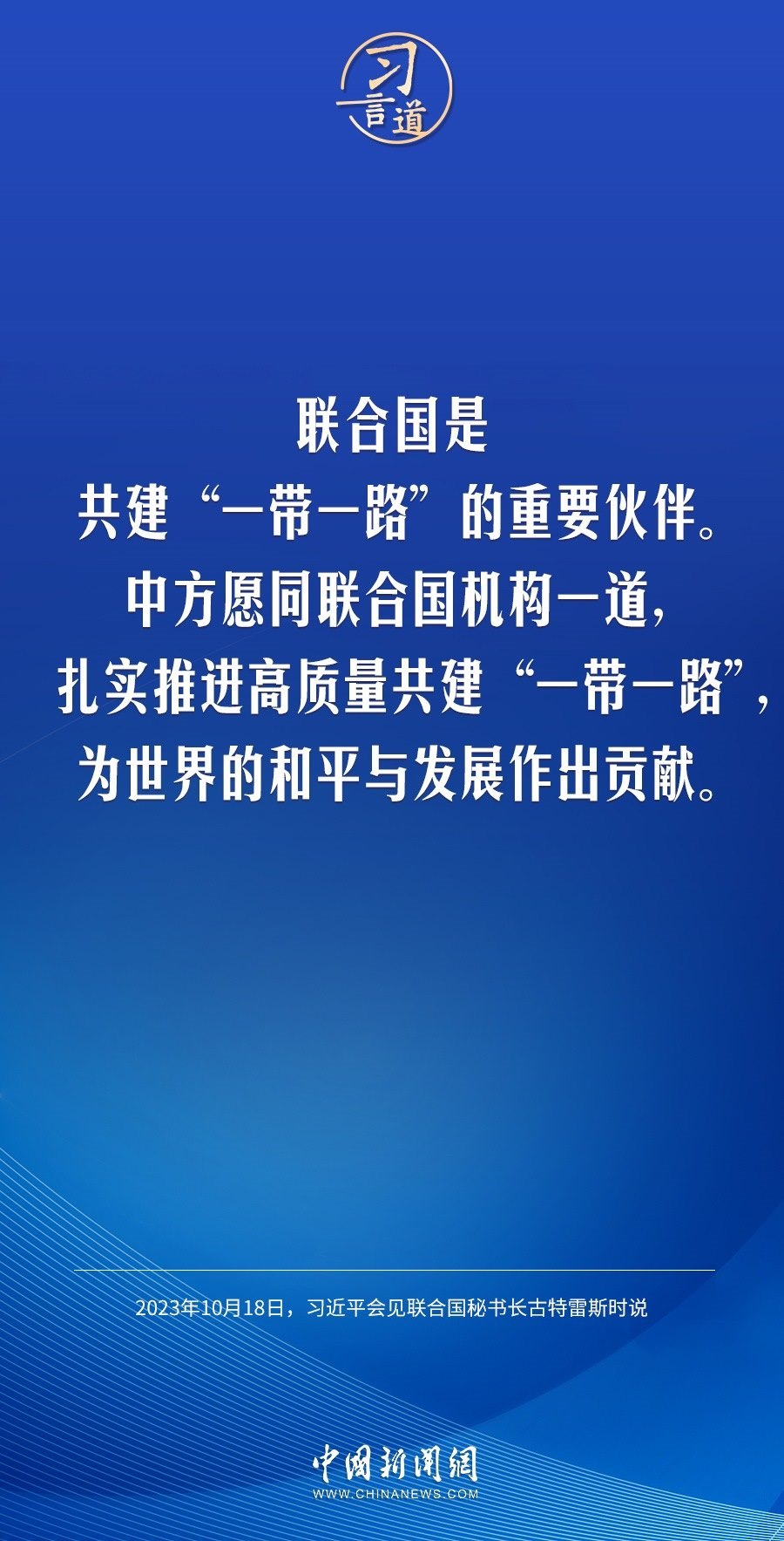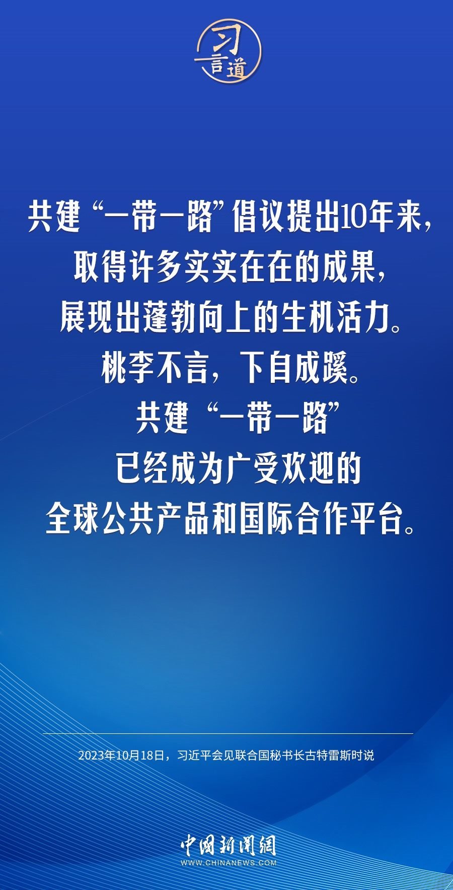 10月18日晚,中國(guó)國(guó)家主席習(xí)近平在人民大會(huì)堂會(huì)見(jiàn)來(lái)華出席第三屆“一帶一路”國(guó)際合作高峰論壇的聯(lián)合國(guó)秘書(shū)長(zhǎng)古特雷斯。習(xí)近平指出——