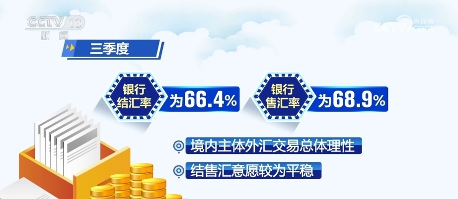 三季度,銀行結匯率為66.4%、銀行售匯率為68.9%。境內主體外匯交易總體理性,結售匯意愿較為平穩(wěn)。