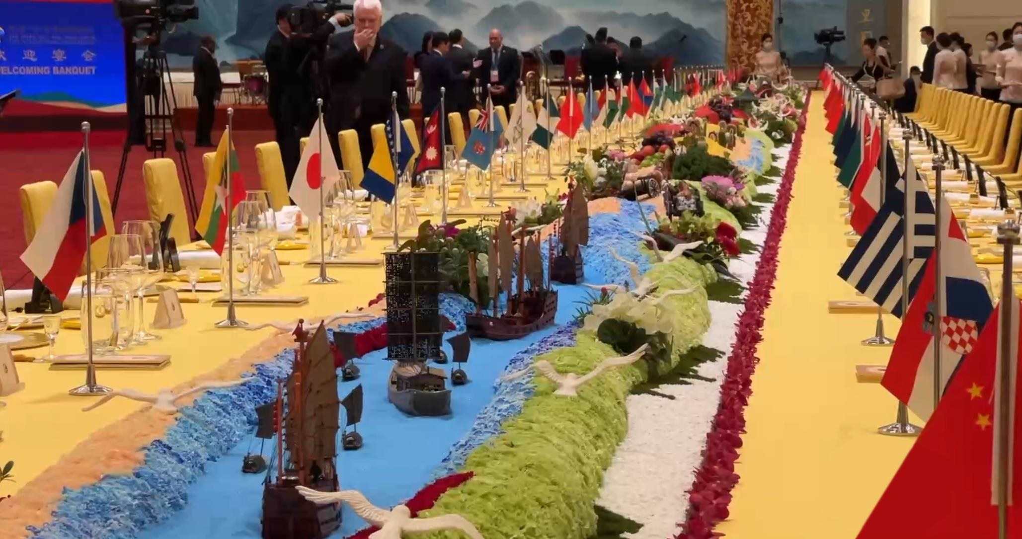 在10月17日晚舉行的歡迎宴會(huì)上,嘉賓們被這樣一個(gè)細(xì)節(jié)深深打動(dòng)——晚宴餐臺(tái)以“撫古觀今、擁抱未來”為主題,南側(cè)展示著古代絲綢之路的微觀景象:海邊碼頭上擺放著對(duì)外出口的瓷器、絲綢、茶葉等貿(mào)易物資,路上擺放有從西域引進(jìn)的蔬菜瓜果;餐臺(tái)北側(cè)為21世紀(jì)絲綢之路的景觀:以北京天壇的裝飾為起點(diǎn),中間穿插高鐵、中歐班列、新能源汽車等擺件,展現(xiàn)各國(guó)互聯(lián)互通的景象……