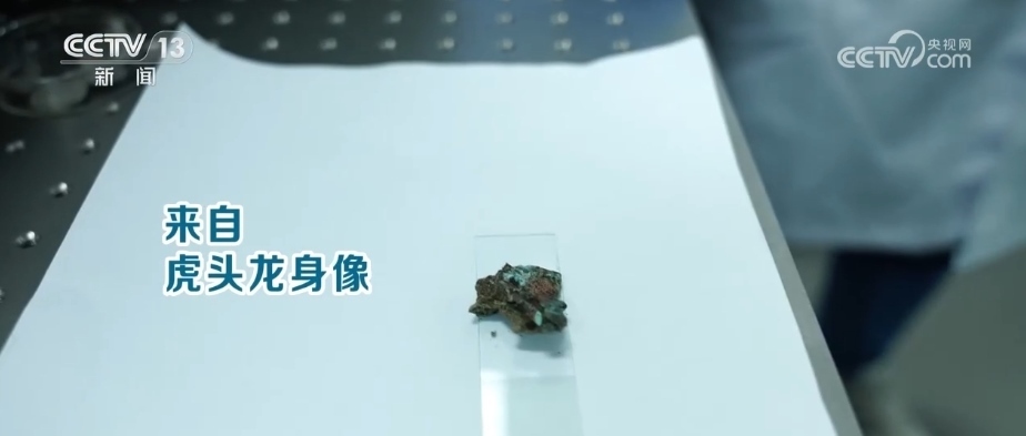 四川省文物考古研究院館員 肖慶:這件樣品是從8號坑的虎頭龍身像上取下來的樣品。這件器物的特別之處就是在它的底座上,有很多紅顏色類似顏料樣的東西?,F(xiàn)在要做的就是來確定這個紅色的顏料到底是什么物質。