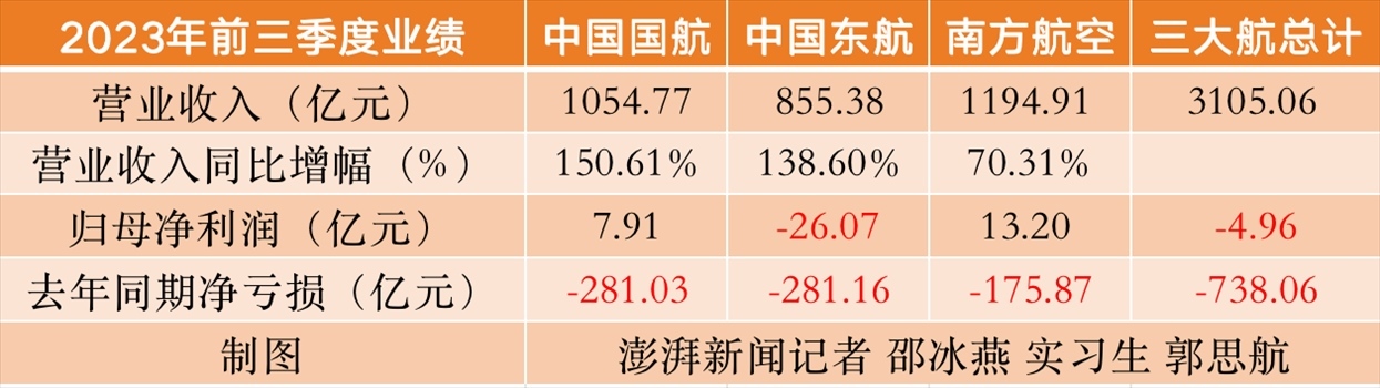 截至10月27日晚間,中國國航(601111.SH)、中國東航(600115.SH)、南方航空(600029.SH)陸續(xù)披露完2023年三季報。前三季度,三大航合計實現(xiàn)營收3105.06億元,凈虧損4.96億元。其中三大航三季度單季均實現(xiàn)扭虧,前三季度中僅東航仍虧損。