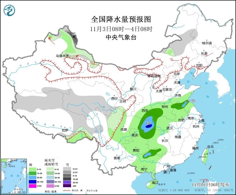 11月3日08時(shí)至4日08時(shí),內(nèi)蒙古東部、新疆北部、西藏北部和東部、青海中南部、川西高原北部等地部分地區(qū)有小到中雪,其中,新疆阿勒泰地區(qū)等地部分地區(qū)有大到暴雪(10~12毫米);陜西南部、四川東部、重慶中東部、湖北西部、河南西部、安徽北部、江蘇北部、廣西北部等地部分地區(qū)有中到大雨,其中,湖北西部、重慶東北部等地部局地有暴雨(50~60毫米)。內(nèi)蒙古中西部、吉林中部、遼東半島、新疆北部等地部分地區(qū)有5~7級(jí)風(fēng),其中,新疆北部和東部部分地區(qū)有7~8級(jí)風(fēng),陣風(fēng)9級(jí)(見圖3)。