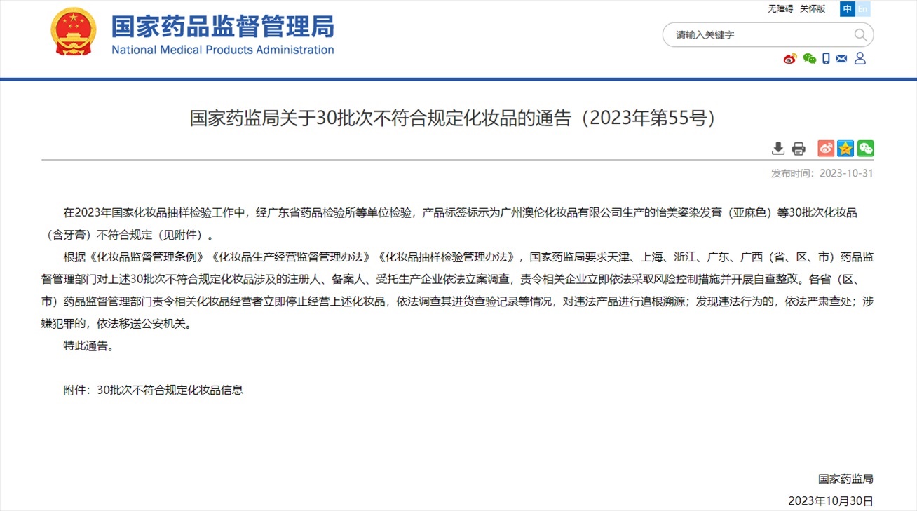 ·國(guó)家藥監(jiān)局發(fā)布通告,化妝品抽樣檢驗(yàn)發(fā)現(xiàn)30批次化妝品(含牙膏)不符合規(guī)定。