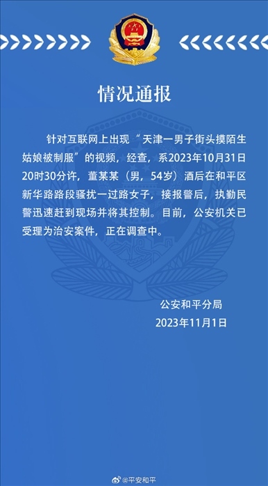 ·天津一男子街頭騷擾過路女子被警方控制,警方:已受理為治安案件。