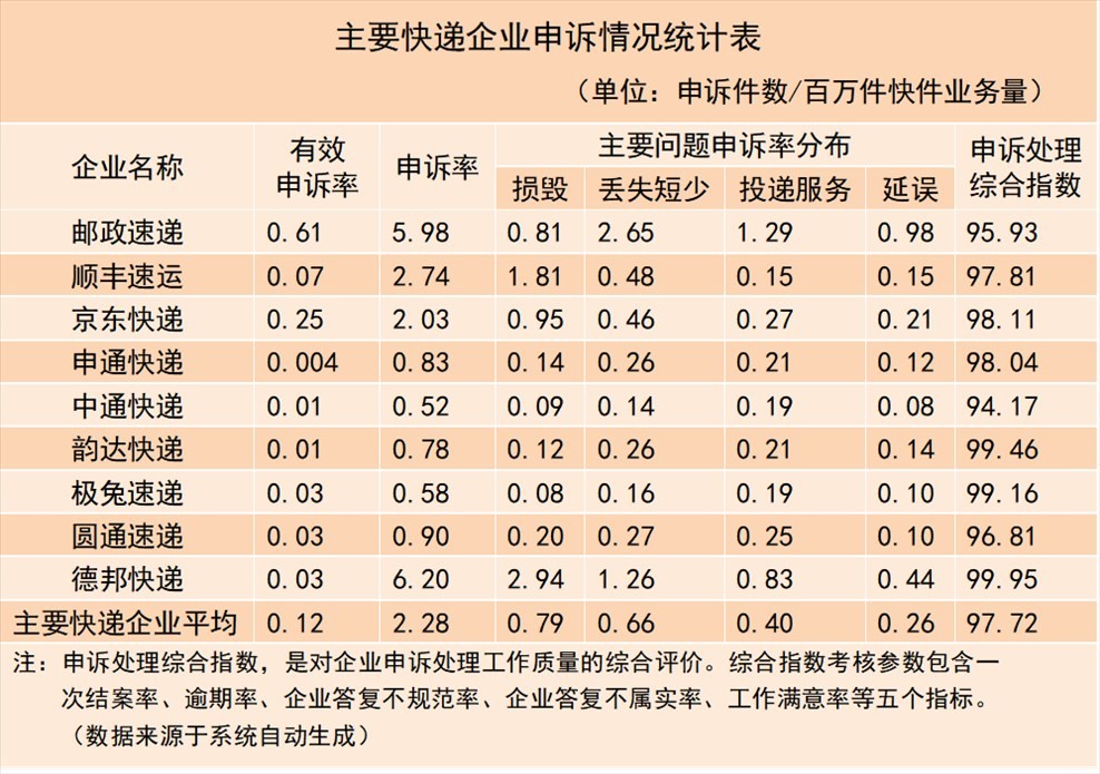 3.主要快遞企業(yè)申訴情況。主要快遞企業(yè)申訴率(百萬(wàn)件快件業(yè)務(wù)量)平均為2.28,有效申訴率平均為0.12。用戶對(duì)快遞服務(wù)申訴主要問(wèn)題中,快件損毀申訴率平均為0.79,快件丟失短少申訴率平均為0.66,投遞服務(wù)申訴率平均為0.40,快件延誤申訴率平均為0.26;主要快遞企業(yè)申訴處理綜合指數(shù)平均為97.72,高于平均值的有6家,低于平均值的有3家。