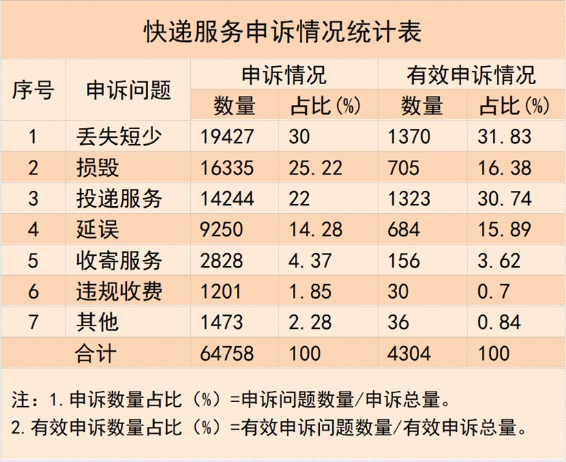 三、快遞服務(wù)申訴情況1.快遞服務(wù)申訴問(wèn)題數(shù)量與類別情況。用戶對(duì)快遞服務(wù)問(wèn)題申訴64758件,其中有效申訴4304件,占比6.65%。有效申訴涉及的主要問(wèn)題依次是快件丟失短少、投遞服務(wù)和快件損毀,分別占有效申訴總量的31.83%、30.74%和16.38%。