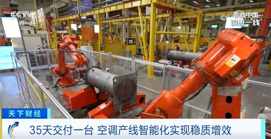 可以看到我身邊這條過道旁擺滿了產(chǎn)品,目前這家工廠所生產(chǎn)的中央空調(diào)處于訂單爆滿的狀態(tài)。生產(chǎn)一臺(tái)中央空調(diào)所需要的工序能夠達(dá)到上百道,目前這座“燈塔工廠”目前能夠做到最快35天交付產(chǎn)品,這與超級(jí)產(chǎn)線背后的智能化改造密不可分??照{(diào)主機(jī)下方的大型腔體,它內(nèi)部最多將安裝上千根換熱銅管,這些銅管與腔體之間沒有任何的焊接或黏合,是完全通過膨脹變形來完成固定與密封。這就意味著銅管安裝的好壞直接決定了這臺(tái)主機(jī)會(huì)不會(huì)泄漏制冷劑。目前這道工序已經(jīng)交由機(jī)械臂來完成,不僅安裝的時(shí)間由原來人工的兩個(gè)小時(shí)縮短至四十五分鐘,而且通過人工智能視覺檢測(cè)技術(shù),保障空調(diào)主機(jī)零泄漏。
