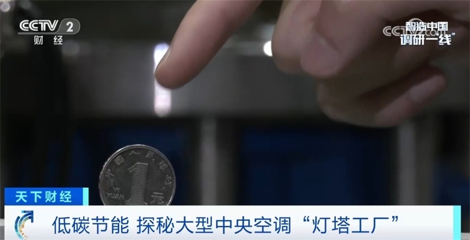 我現(xiàn)在走進(jìn)的這個(gè)區(qū)域是空調(diào)產(chǎn)線的末端——檢測(cè)平臺(tái)。每一臺(tái)空調(diào)出廠前都要在這里經(jīng)過全方位的檢測(cè)。眼前這就是一臺(tái)正在運(yùn)轉(zhuǎn)的氣懸浮中央空調(diào),我們?cè)诳照{(diào)上立了一枚硬幣,可以看到是紋絲不動(dòng)的,這也是氣懸浮的特點(diǎn)之一——運(yùn)行比較平穩(wěn)。在這塊屏幕上顯示著空調(diào)的出水溫度7℃,恒定的出水溫度讓這臺(tái)空調(diào)產(chǎn)生的冷風(fēng)非常柔和。目前,這座工廠全流程的自動(dòng)化生產(chǎn)能夠滿足從小型商用空調(diào)生產(chǎn)到用戶需求的大規(guī)模定制。目前低能耗、智能化產(chǎn)品已應(yīng)用在商業(yè)地產(chǎn)、酒店、軌道交通等各種場(chǎng)景,極大程度助力著國家“雙碳”政策以及各大行業(yè)的低碳轉(zhuǎn)型。