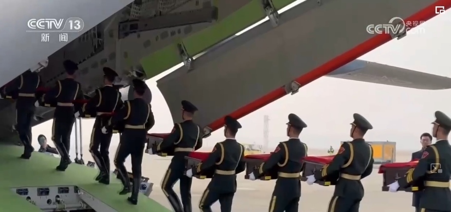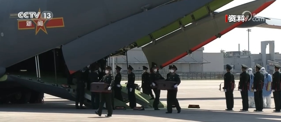 隨后,中方禮兵護(hù)送棺槨走上中國空軍運(yùn)-20運(yùn)輸機(jī)。北京時(shí)間11月23日上午,運(yùn)-20運(yùn)輸機(jī)從仁川國際機(jī)場(chǎng)起飛。