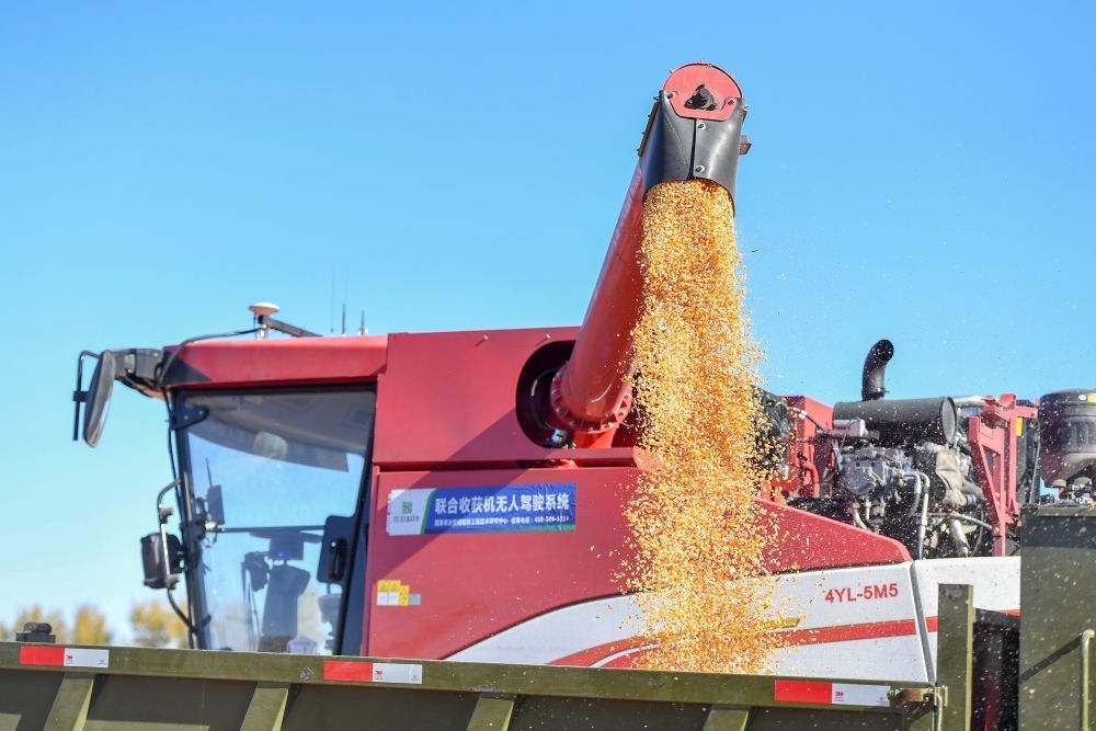在中國科學院“黑土糧倉”科技會戰(zhàn)長春示范區(qū)公主嶺示范基地,無人駕駛農(nóng)機將收獲的玉米裝車(2023年10月19日攝)。新華社記者 張楠 攝