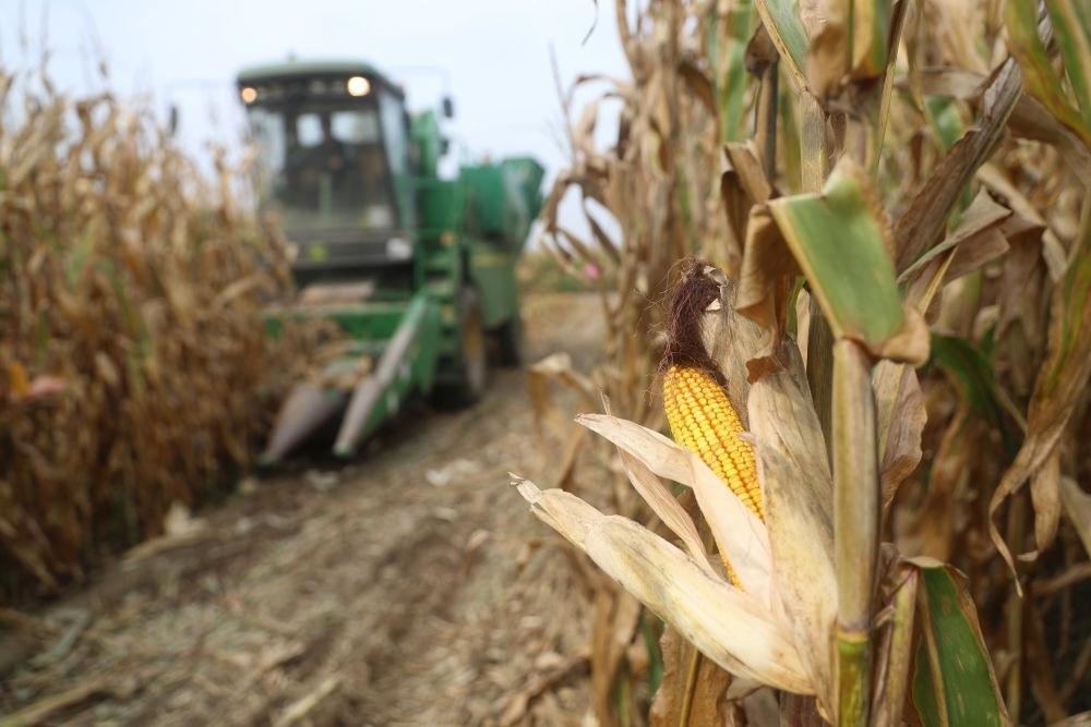在遼寧省鐵嶺縣蔡牛鎮(zhèn)的玉米田里,農(nóng)民駕駛農(nóng)機收割玉米(2023年9月26日攝)。新華社記者 楊青 攝
