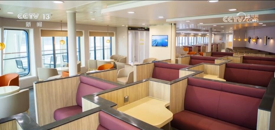 不僅操作靈巧、動(dòng)力強(qiáng)勁,船上還為旅客提供了游戲區(qū)、兒童區(qū)、餐飲區(qū)等超過(guò)1萬(wàn)平方米的公共活動(dòng)區(qū)域。通過(guò)建立完整的產(chǎn)業(yè)鏈,內(nèi)裝方面已實(shí)現(xiàn)了從設(shè)計(jì)、制造、安裝全過(guò)程100%國(guó)產(chǎn)化。