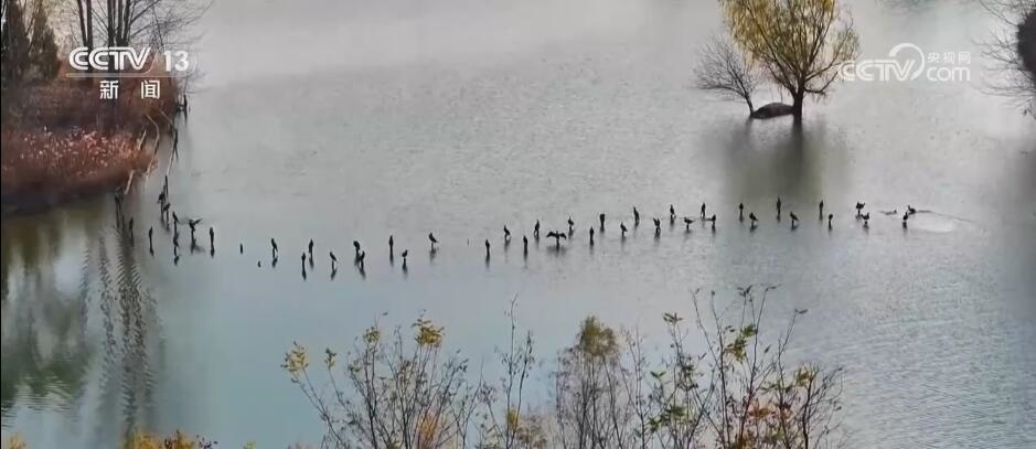 近日,陜西西安浐灞國家濕地公園迎來了大批候鳥在此越冬。在濕地公園中的一座人工小島上,捕食歸來的鸕鶿站在湖水中的樹樁上,張開翅膀沐浴陽光。
